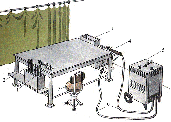 1 – інструмент зварника; 2 – електроди; 3 – стіл зварника; 4 – электродотримач; 5 – зварювальний трансформатор; 6 – зварювальний дріт; 7 – стілець зварника
