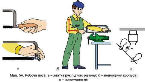 Різання зі зняттям стружки здійснюють ручною ножівкою (мал.54), на ножівкових, кругло-пиляльних, токарно-відрізних верстатах, а також може бути газове, дугове різання без зняття стружки, матеріали розрізують ручними важільними і механічними ножицями, гострозубцями, труборізами, прес-ножицями, у штампах. До різання належить також надрізування металу.