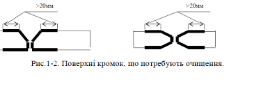 Кромки та прилеглу зону (шириною 20-30 мм з кожного боку) очищують від іржі, фарби, окалини, масла та інших забруднень до металевого блиску щітками, полум'ям, а при відповідальних з'єднаннях використовують травлення, знежирення, піско струменеву обробку.