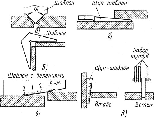 а - кута розкриття кромки, б - прямого кута, в - зміщення листів, г -зазора між листами при зварюванні внахлестку, д - зазору при зварюванні втавр і встик