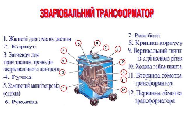 Звернути увагу учнів на регулювання зварювального струму, де і як регулюється (обертанням рукоятки за годинниковою та проти годинникової стрілки). Указати місце заземлення кожуха трансформатора.