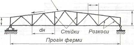 2. | Будова ферм | Ферма складається з трьох основних конструктивних елементів: верхнього та нижнього поясів і решітки. Остання складається із розкосів і стійок. Віддаль між вузлами решітки ферми називається панеллю, а віддаль між її опорами – прогонами. | ||